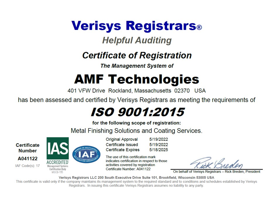 AMF Technologies is a metal finishing company in Rockland, Massachusetts, located just 20 miles south of Boston. The company was founded as Arborway Metal Finishing, Inc. by Thomas O’Mara in 1980.